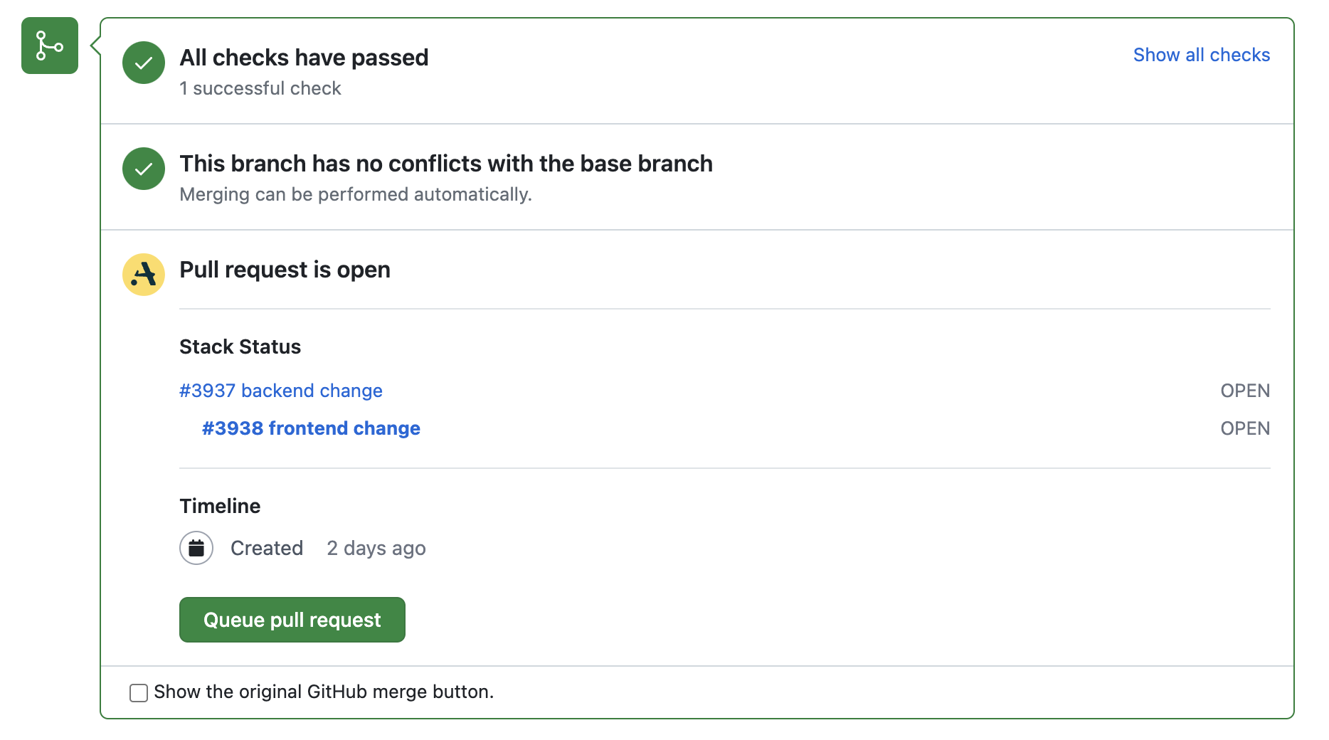 [<mark style="color:blue;">Aviator MergeQueue</mark>](https://docs.aviator.co/mergequeue) is a powerful merge-based automated workflow for pull requests in your GitHub repository and keeps your primary branch passing. Although completely optional, using the Aviator MergeQueue along with the stacked PRs CLI can significantly improve the developer experience for [<mark style="color:blue;">merging and updating the PRs</mark>](https://docs.aviator.co/mergequeue/how-to-guides/merging-stacked-prs).