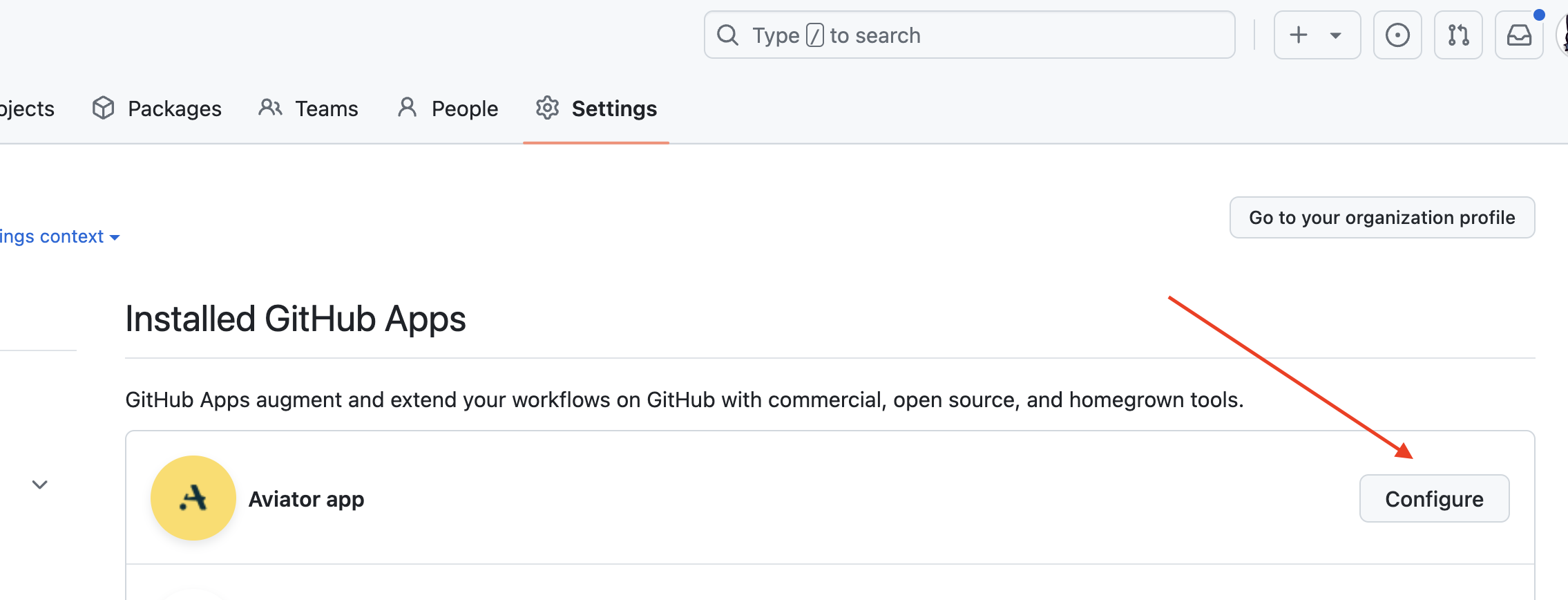 &#x20;and click on "GitHub apps". Then click "Configure" next to the Aviator app.