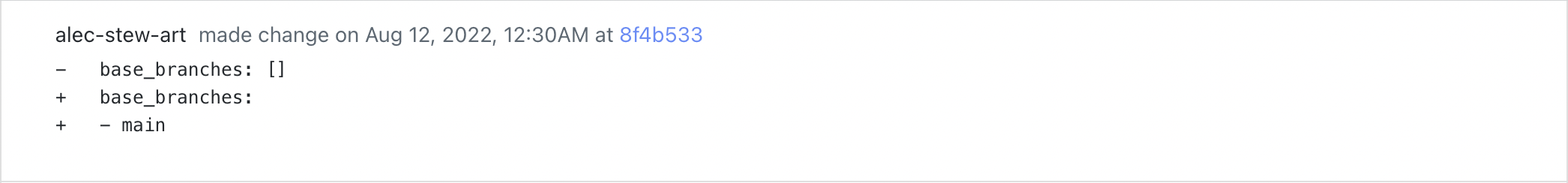 Finally, when your YAML configuration file is set up in your repo, we store the `github_user` who pushed the changes onto your repo's default branch, the commit the change was made in, the time of the commit, and again the `diff` between the updated config file and the previous one.
