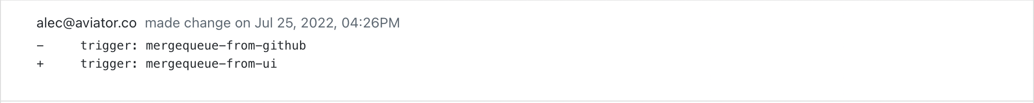 When changes are made from the [<mark style="color:blue;">Merge Rules</mark>](https://app.aviator.co/github/rules) dashboard, we store the logged in `aviator_user` that made them, the time the change was made at, and a `diff` of the new configuration to the previous one.
