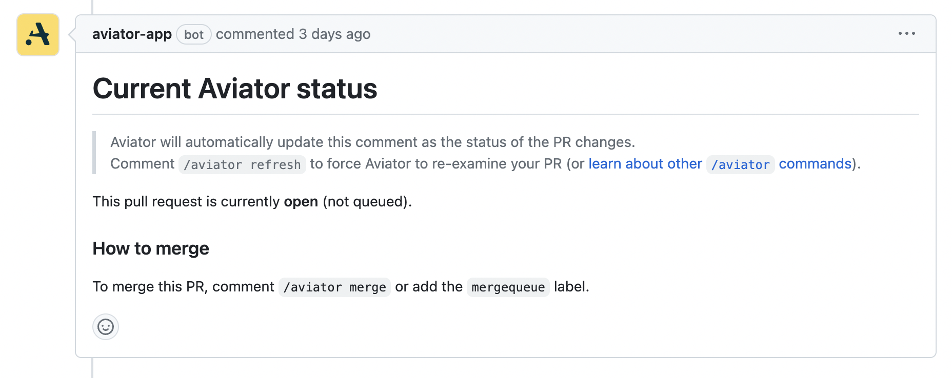 Aviator posts a comment when a PR is opened, and will automatically update the comment as the PR moves through its lifecycle. This is a great way to stay up to date and identify any reasons that may have dequeued your PR or is preventing your PR from merging.