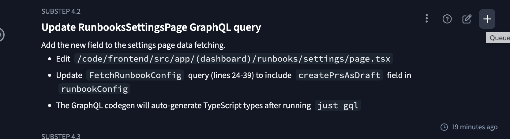Every Runbook creates [one or more steps](https://docs.aviator.co/runbooks/concepts/runbook-format), with larger tasks that may go into hundreds of steps and substeps. These steps are designed to be executed in-order as a subsequent step in the Runbook may have dependency on a previous step completed.