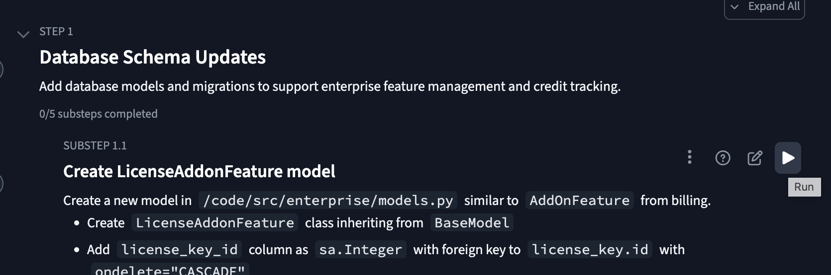 You can alternatively also click on "Run" button next to a Step or a Substep. Keep in mind when clicking "Run" button that: