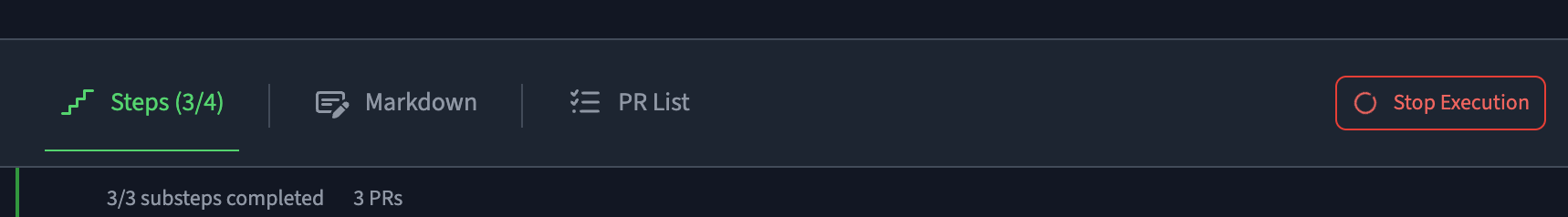Execution of any step can be perfomed by either clicking "Stop" on the Claude code message bar, or by clicking "Stop execution" button at the top right on the Steps view.